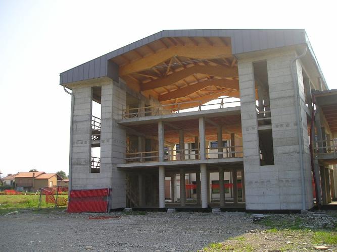 La mole del complesso è mitigata dall’utilizzo di forme curvilinee; i materiali utilizzati riprendono la tradizione edilizia del paese bergamasco.