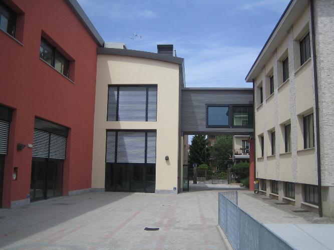 Considerata la ridotta dimensione dell’area, il progetto ha proposto la realizzazione di un corpo indipendente su due piani, con la mensa al piano terra (completa di cucina e spazi accessori) e cinque aule al piano superiore, collegate all’edificio esistente con un percorso aereo, realizzato in metallo durante la pausa estiva.