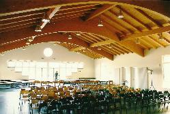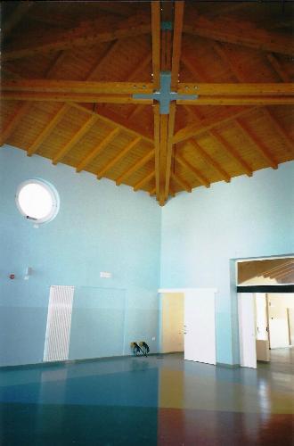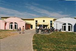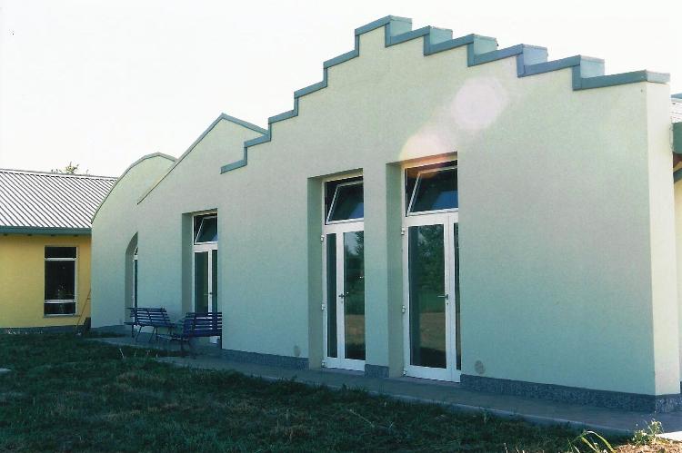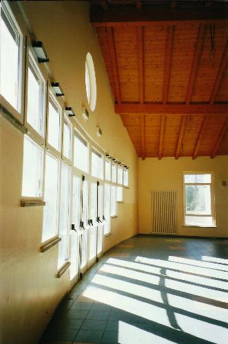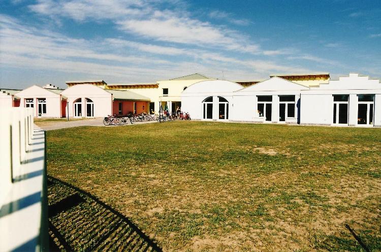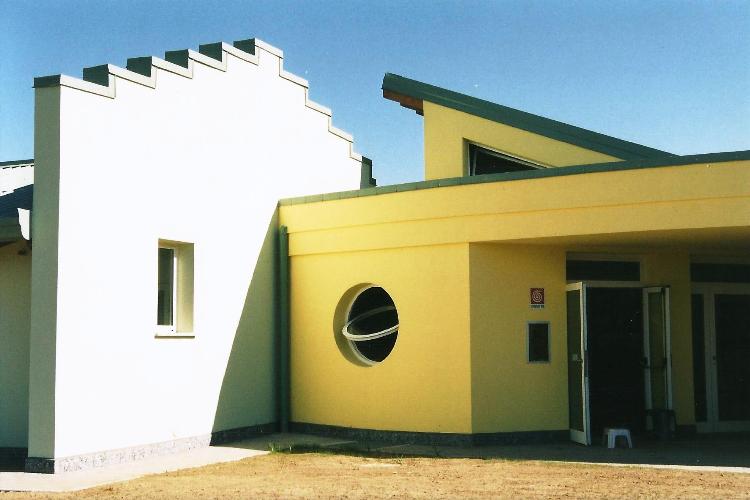 L’orientamento dell’edificio consente la migliore esposizione delle aule al calore e alla luce naturale, con l’ingresso principale sul lato ovest e gli spazi di servizio e la cucina sul lato est, ove è situato l’ingresso secondario.
