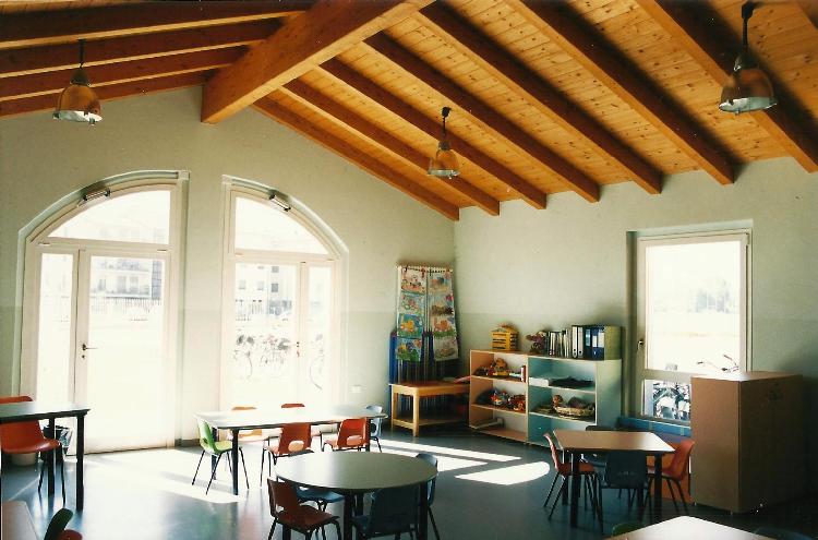 A partire dal lotto assegnato, il progetto è stato definito in modo da riservare grande spazio al verde, al quale i bambini accedono direttamente dalle aule.