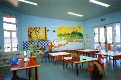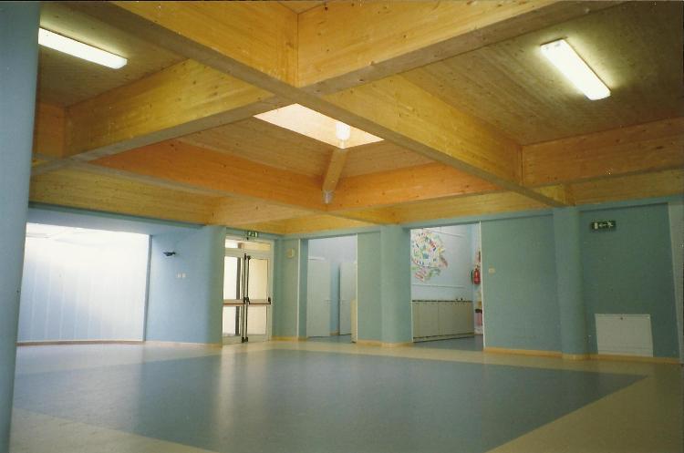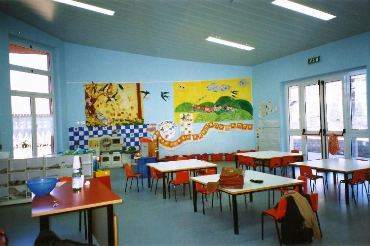 Dall’aula centrale si accede ad uno spazio destinato alle attività comuni delle due nuove sezioni, con una appendice semicircolare che si presta all’utilizzo quale teatrino.