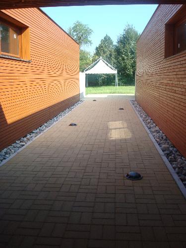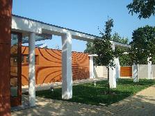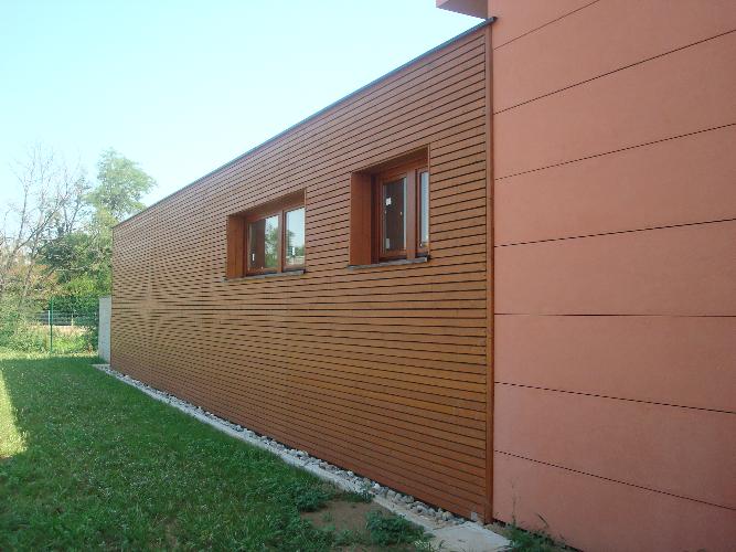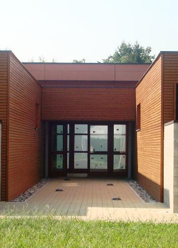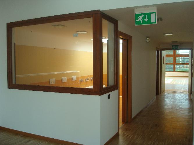 Pertanto si è optato di affiancare a sistemi di consolidata affidabilità (quali la struttura in cls armato, le murature in laterizio e i tetti in legno), sistemi costruttivi innovativi ad alti standard prestazionali, quali le strutture in elevazione in legno lamellare e sistemi parete con tecnologia Thermowood per i corpi aule e rivestimenti esterni delle pareti opache in lastre di fibrocemento per il corpo contenente i servizi e le parti comuni;