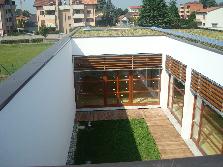 Le coperture sono in legno lamellare con manto in lamiera preverniciata per i corpi aule mentre per il corpo servizi con sistema a “tetto verde”.