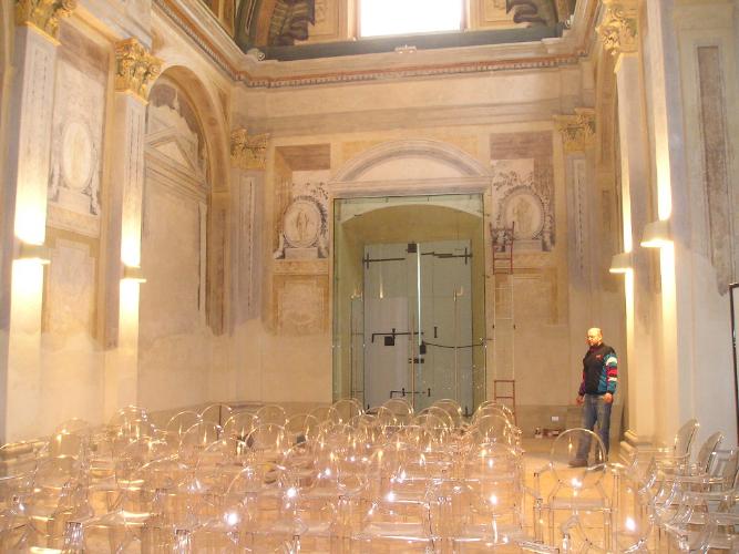 Restauro della chiesa ad uso sala conferenze (con capienza di circa 70 sedute) e/o mostre temporanee ritenendo compatibile tale funzione con il corretto recupero dell’edificio, a condizione di conservarlo nella sua integrità. Non sono previste integrazioni pittoriche nelle parti mancanti.