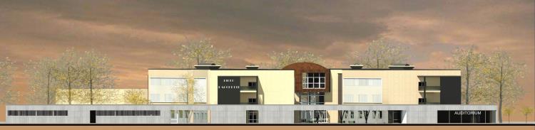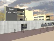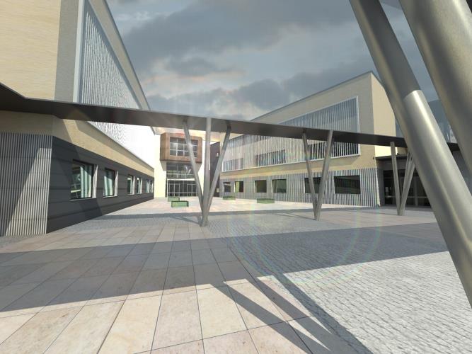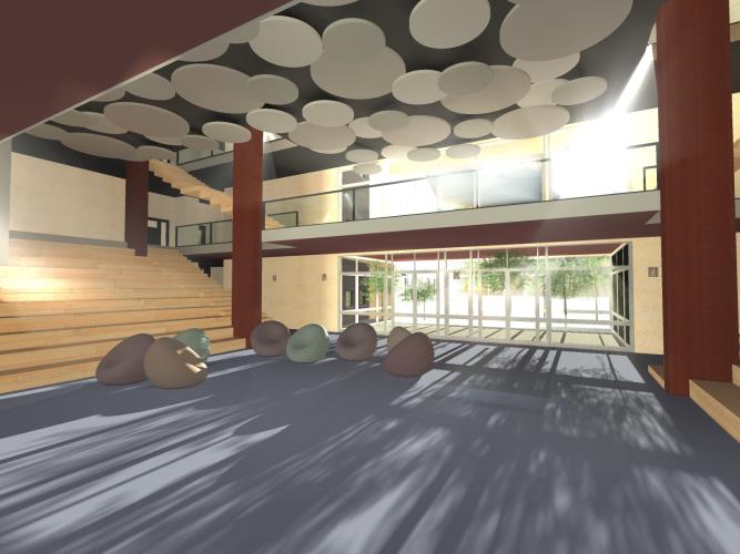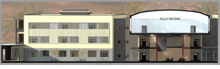 Il corpo centrale è costituito da un ampio ingresso con funzione di piazza/agorà della scuola,
