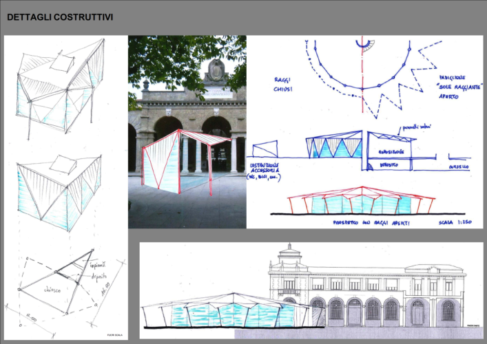 Il riferimento architettonico richiama la funzione dell’antica Fiera e la soluzione tecnologica dei raggi apribili per aumentare la superficie espositiva richiama lo stemma della città: il sole raggiante.