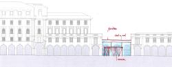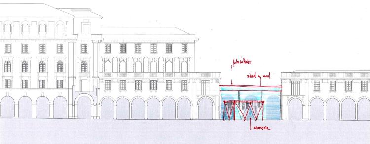 Si propone pertanto la creazone di spazi commerciali ed espositivi coperti stabili (in modo da non ricorrere agli stand mobili) e che consentano una rapida rotazione dei soggetti che espongono, e siano utilizzabili in tutte le stagioni, coprendo la piazzetta interna al Quadriportico con una struttura in ferro/vetro al fine di realizzare un mall, un polo commerciale-terziario coperto. La testata nord del mall è dotata di un accesso (con ascensore) all’ex albergo diurno, in modo da collegare anch’esso al complesso commerciale.