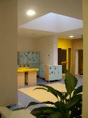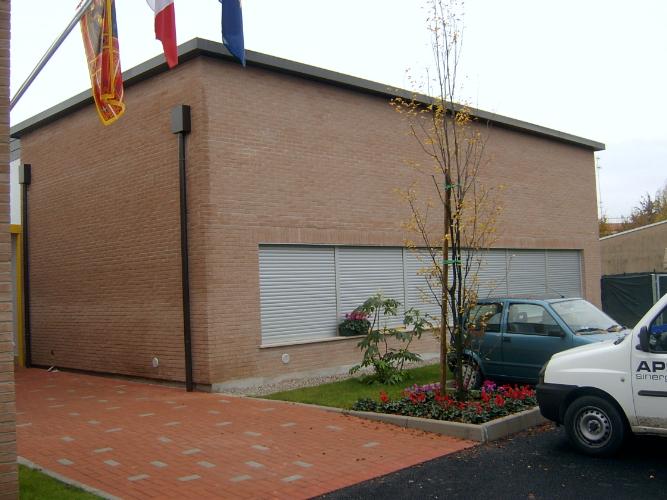 Il corpo delle attività è costituito da due parallelepipedi rivestiti con mattoni facciavista tra i quali è distesa una grande falda inclinata.