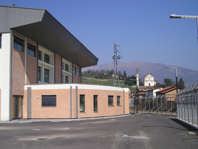 Il contesto paesaggistico di qualità e la presenza di un’ampia piazza circolare, ha portato a sviluppare il progetto su un asse centrale costituito dai corpi della direzione didattica e del palazzetto, cui si innestano le ali delle due scuole, della palestra e della mensa.