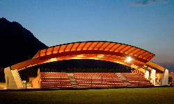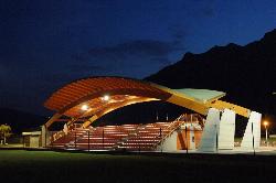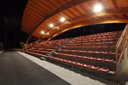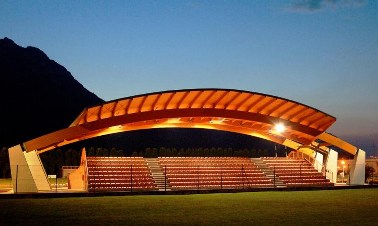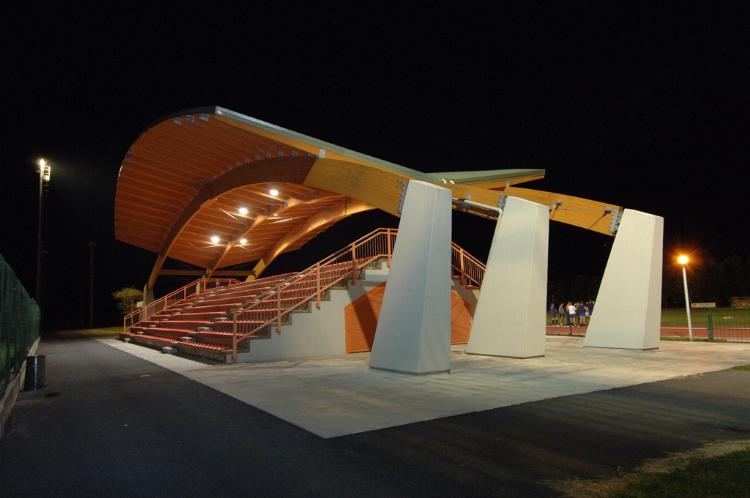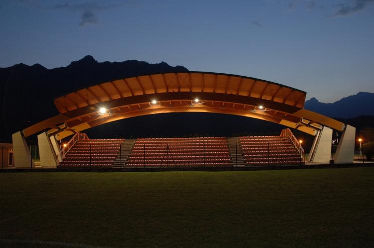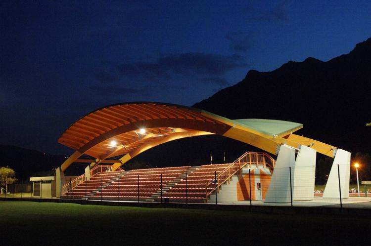 La copertura della tribuna del campo di calcio è costituita da tre archi in legno lamellare sostenuti da contrafforti in calcestruzzo (disposti ortogonalmente alla gradinata in modo da non avere alcun ostacolo alla visuale) e manto di copertura in perline di legno e lamiera di alluminio.
