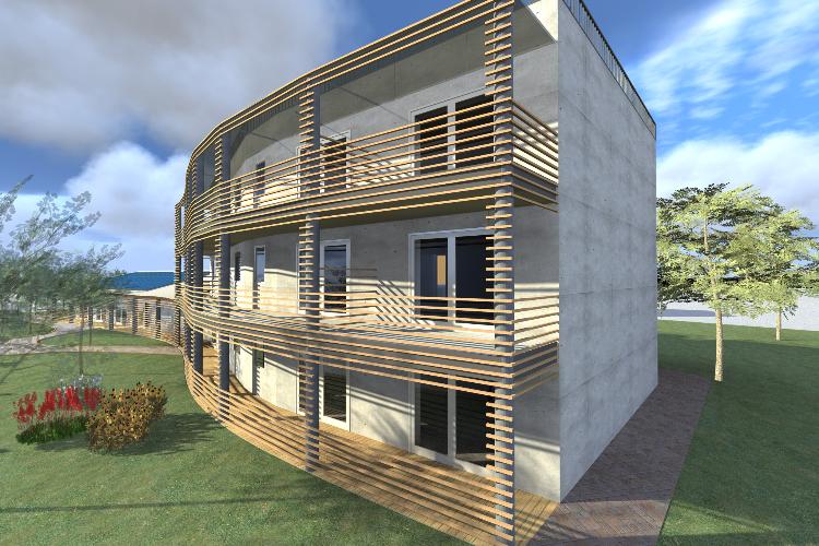 Il corpo delle residenze contiene al piano terra due locali di soggiorno comuni, rivolti a sud e dotati di ampie porte-finestre (tali da aprire lo spazio verso il giardino nella stagione favorevole), e locali tecnici. Al piano primo sono previste tre unità abitative ed un locale lavanderia con balcone-stenditoio. Al piano secondo sono collocate tre unità abitative ed un monolocale a disposizione dell’assistente/badante.